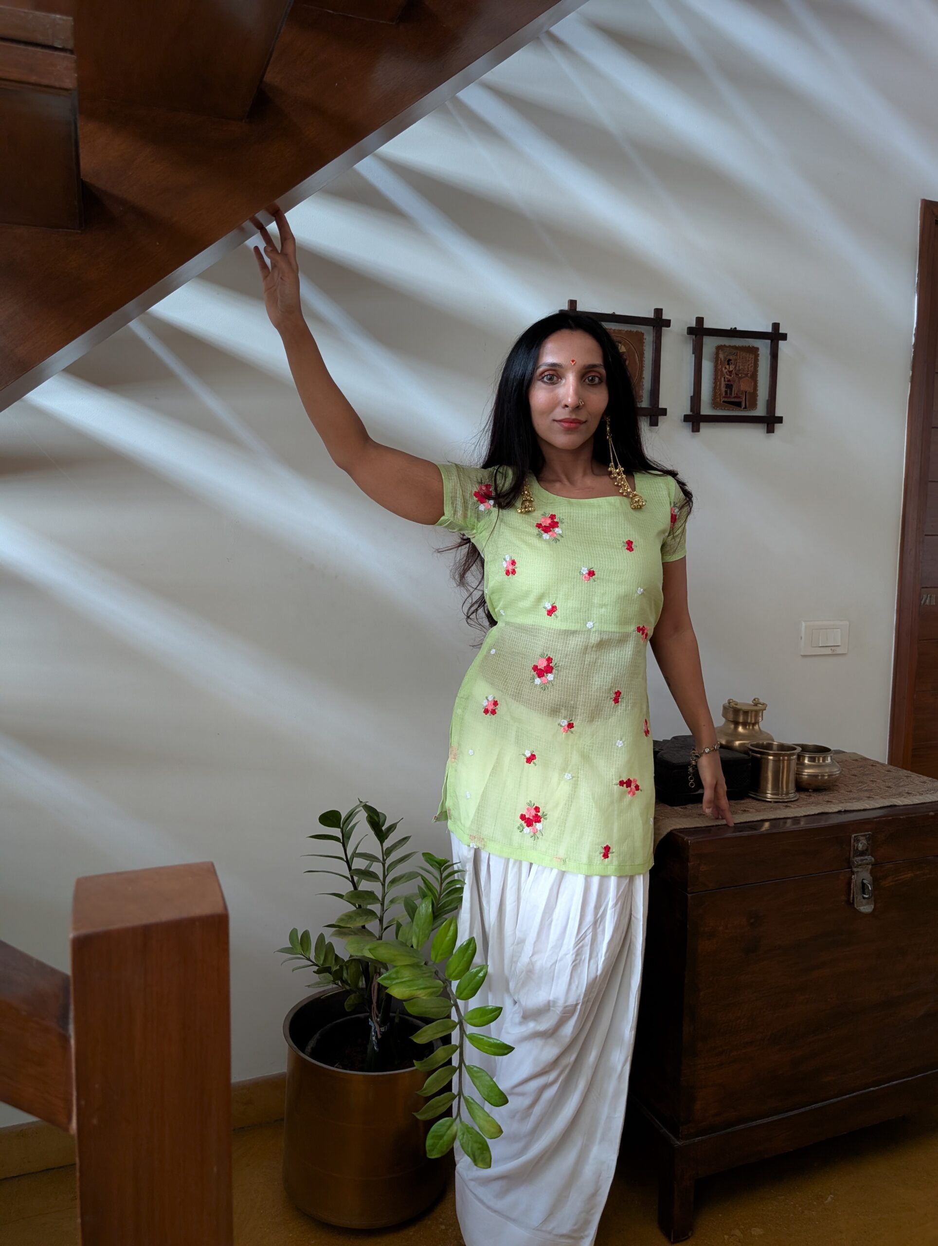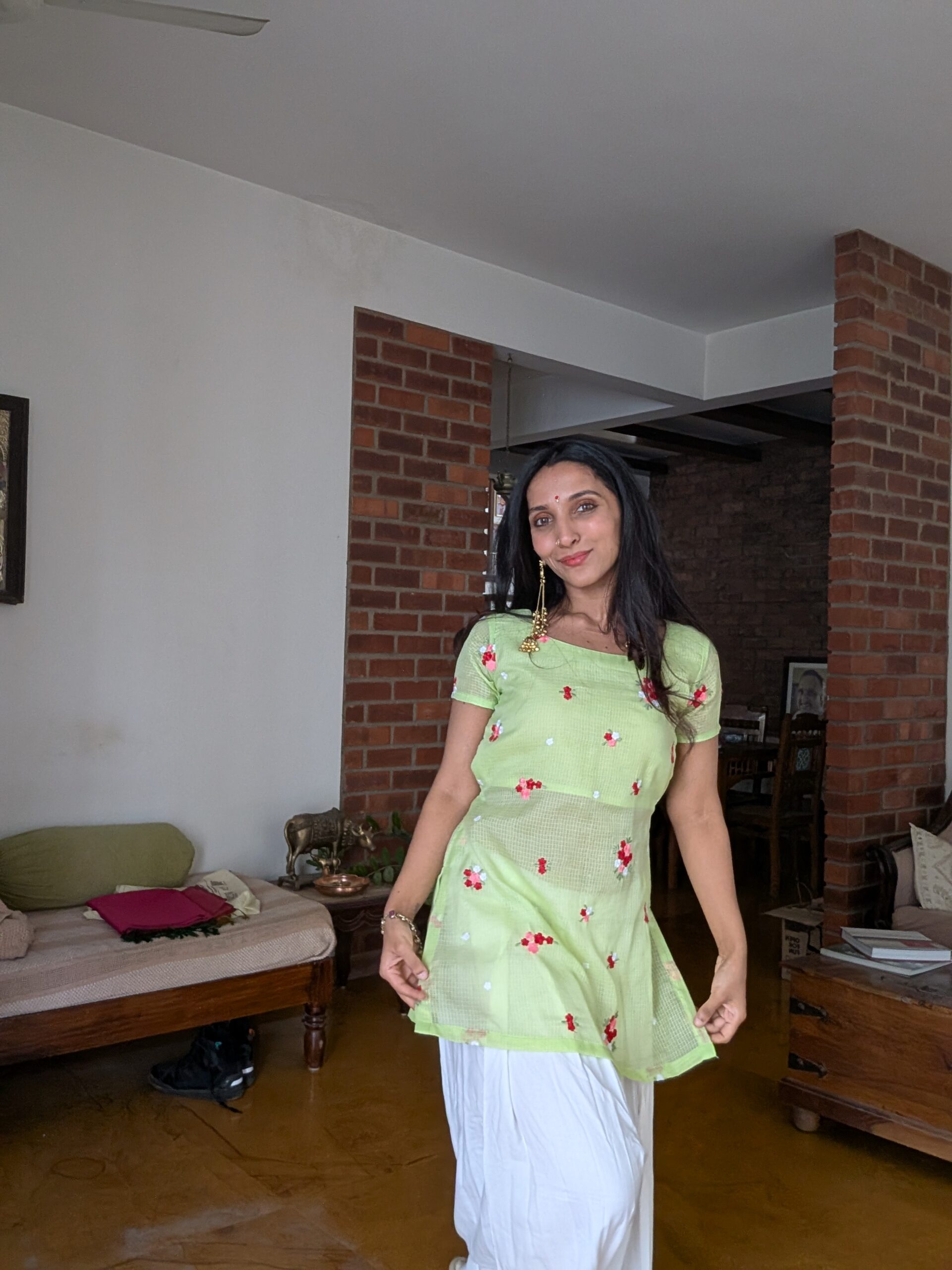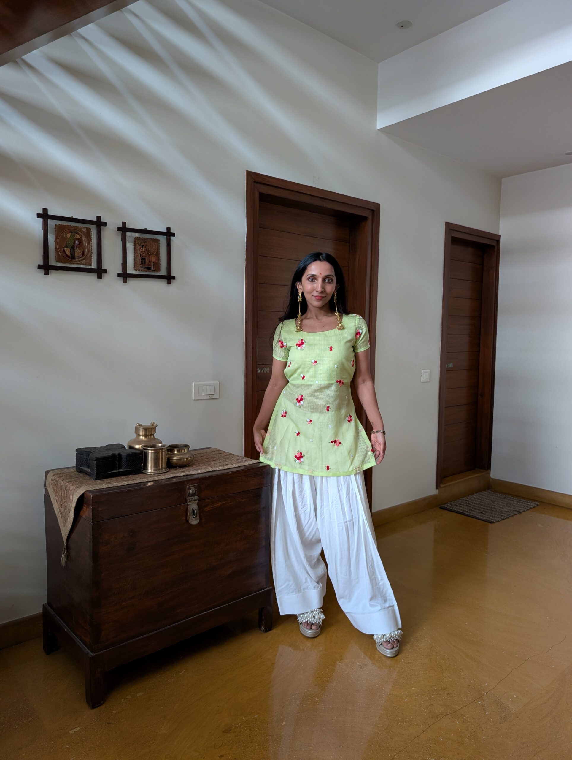 We’ve paired this translucent, airy kurta with our signature white cotton Farshi salwar. It’s voluminous, intentional, and offers a beautiful contrast to the structured daintiness of the top. It’s not just an outfit; it’s a mood that says you’re ready to float through the Indian summer.